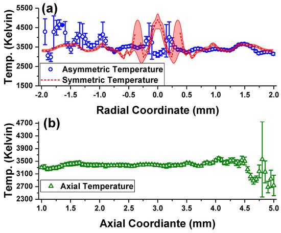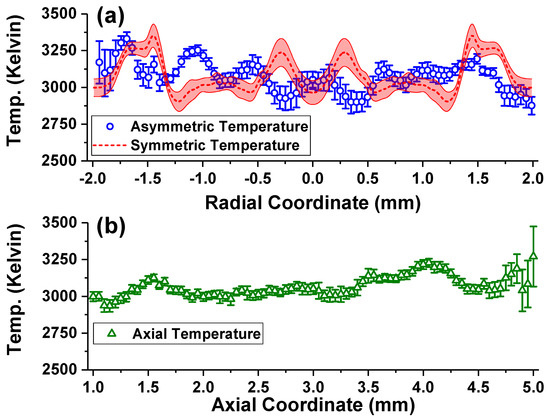 Figure 3 and Figure 4 show calculated temperatures both in the lateral direction on the plasma plume height and in the deconvolved radial directions for 20 μs and 35 μs time delay following plasma initiation, respectively. These times were chosen to illustrate the different behaviors of the plasma expansions at two time delays that were as distinct as possible from each other. Furthermore, in order to maximize the number of spatial data points available for analysis, the later time delays were selected for analysis when the plasma had expanded to a sufficient spatial extent on the detector. Selecting later time delays also has the added benefit of avoiding hydrogen Balmer series beta line interferences which would severely impact and complicate molecular line profile fitting. It must also be stated that the two temporal points used for this study are insufficient for detailing the temporal decay of the temperature, though some manner of exponential decay is expected. The goal of this work is to investigate spatial temperature distributions. For the sake of validity of application of the asymmetric Abel inversion method to molecular emissions in laser ablation plasma, temperature inferences in which a symmetric Abel inversion was calculated are also presented. The shaded region surrounding the symmetric Abel deconvolution (red dashed line) in Figure 3 and Figure 4 represents the uncertainty of this temperature inference.