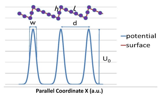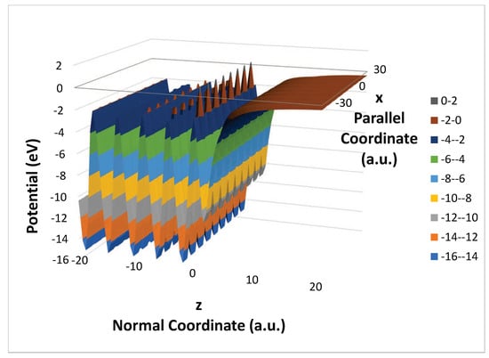 Schematic of two-dimensional vicinal stepped potential on flat Pd(111) with d being five atomic layers developed using the Kroenig-Penny (KP) potential in Figure 1 which is super-imposed on the one-dimensional parametric potential of Pd(111) [32,33] in Figure 2 (bottom panel). The KP potential is attenuated going far from the precursor flat surface both towards the bulk and the vacuum. To aid visualization, the peaks of the KP potential are scaled by a factor of 2.8 in the figure. Note that the maximum vicinal peaks occur at .