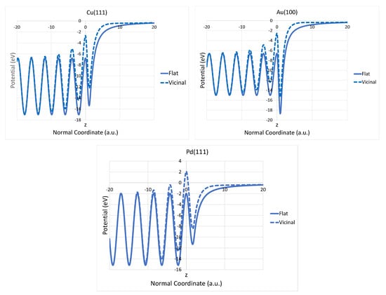 where is the dynamically changing perpendicular distance between the line (see below) of the fixed-in-space metal surface and the ion moving along a trajectory. The potential, , of the vicinal surface has two components. The first component is a parametric potential in z that represents the atomic layers of the metal in this direction. The second component is the previously discussed KP potential. The former is obtained from a pseudopotential local-density-approximation method for simple and noble metal surfaces [32,33]. This potential represents the flat surface that the KP potential is superimposed on. This was also the model used in our earlier work with flat surfaces [27,28,29,30] and in our recent work with a vicinal Pd(111) surface [13]. This potential is graphed in Figure 2 for each of the three metals. The topmost atomic layer of the metal is taken at . This was done so that the centers of the atomic layers, for , are given by the peaks in the potential, going into the bulk. The KP potential is exponentially attenuated in the positive and negative directions from its’ peak at . This will limit the effect of the steps going far from the surface. Curves representing a section of along z-direction through a vicinal peak for each metal are also included in Figure 2. Detailed differences among these curves, based on the variation in their flat surface potential properties, suggest that the flat-surface dispersions also influence corresponding vicinal dispersions.