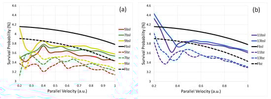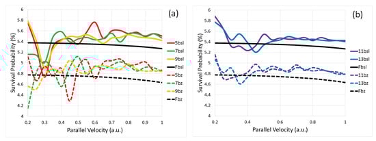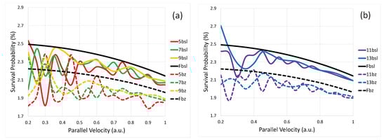 It was found in our previous publication [13] that the distance d between vicinal steps is one important surface structure property that affects the position of the modulation peaks. As mentioned earlier, = 1 a.u. in all results presented here. For larger to a given surface (results not shown) the variations in survival probability became smaller, which is simply due to the fact that a distant ion feels the vicinal steps weakly. The location of the peaks also slightly changed with different , which is connected to the altering ion-surface effective interaction time—the time of being close enough to the surface. The shorter the , the longer is the interaction time. A longer interaction time will allow the ion affinity level to adiabatically shift more in energy [27], causing the electron to land in a KP potential well with a slightly different speed than that for a shorter interaction time. This can slightly offset the peak positions between different values. We discuss this offset further in Section 3.4. The interaction time effect also governs the differences between the results from BZ versus BSL trajectories in Figure 4, Figure 5 and Figure 6. The same = 1 a.u. for both trajectories enables the ion to sense the steps almost equally resulting in roughly the same strength of modulation irrespective of the trajectory. Note that, in all the results, a slowing ion on the BZ trajectory with a longer interaction time produces consistently lower survival rates than that of an ion on a BSL track, since longer times facilitate higher decays. On the other hand, on a BSL path, the affinity level has slightly less time to shift, causing small mismatches in peak positions between BSL versus BZ; we will return to this point again in Section 3.4.