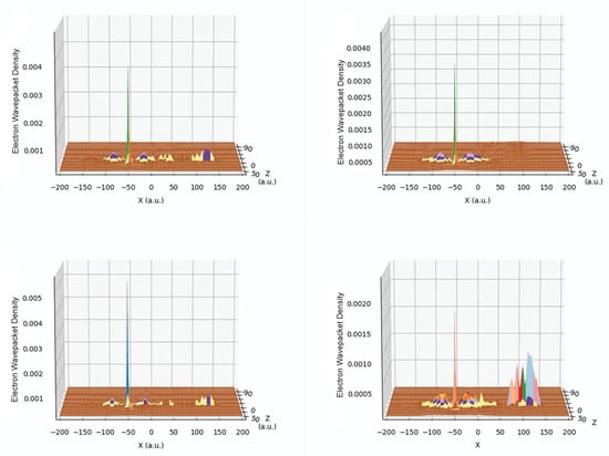 As the hydrogen ion moves toward the surface, the ion survival amplitude given by Equation (4) evolves in time. When the ion gets close to the surface, the probability amplitude Equation (5) can be zero at one or more locations. The electron is therefore transferring back and forth between the metal and the ion at the close vicinity of the surface. Therefore, it is important to understand the RCT process by which the electron populates the states of the metal. This was done by a detailed analysis of the wave packet probability density in our previous publication [13]. Superimposed subband modulations due to vicinal texture on flat substrates are found to form peaks and valleys in Figure 4, Figure 5 and Figure 6 of the survival probability. The effect originates from an interference pattern formed from the probability waves reflecting back and forth between the vicinal steps of the surface. These interference patterns can be seen in the surface and image state pulses (labeled 0 and 1 respectively) shown in the panels of Figure 8 for the different metals. Figure 8 shows snapshots, all at the same instant and for d = 5, from animations of the wave packet probability density as a function of time. In Figure 8, the ion moves from the right to the left heading toward the surface. The surface of the metal is at and the ion is closest to the surface at . For Cu(111), Figure 8b is included for when the ion is aimed at the step. In the other snapshots, the ion is aimed at a point midway between the steps. Note that for Au(100), Figure 8c, the surface state peaks are decaying into the bulk of the metal, whereas the surface state peaks for Cu(111) and Pd(111), Figure 8a,b,d, remain at the surface of the metal. This can be understood from the dispersions shown in Figure 7. For Au(100) the surface state energy is in the valence band, so the electron decays from the surface state into the bulk of the metal. For Cu(111) and Pd(111) the surface state energy is in the band gap so the electron stays in this surface state much longer. The image state stays just outside the surface for all three metals as the image state energies are all within the band gap with the exception of the second image state for Cu(111) which is in the conduction band. Therefore, an electron captured in the second image state would quickly decay into the bulk of the metal via the conduction band.