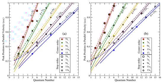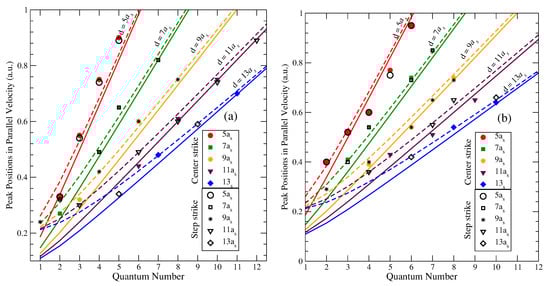 Some detailed observations can be made in Figure 9, Figure 10 and Figure 11. We expect the quantum number of standing probability waves associated with a particular distance between steps, d, to increase with increasing d. This is what is observed. We further expect that the wavelength will not change for a particular velocity. Furthermore, as the parallel velocity, , increases, the quantum number of the corresponding standing wave should also increase since the wavelength decreases. Such expected patterns are generally evidenced in the results as well. There is one feature in the comparison between the results and the model for all three systems which is unexpected: There are intermittently missing bands for d = and . We think that this is probably due to forbidden gaps in the subband structure for corresponding vicinal terrace widths. Furthermore, note that the resonance peak positions for the two different strikes quickly merge into the same graph for d = 5 but they merge more slowly as d increases. In fact, for d = 5 the step strike and midpoint strike peaks occur at the same points, whereas for d = 13 they occur at the same points only for higher values of . This is also the trend the model curves indicate.