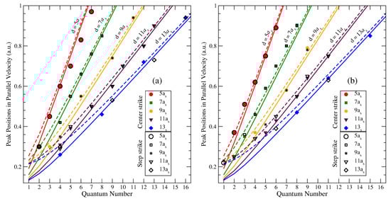 Plots of Equation (8) are shown in Figure 9, Figure 10 and Figure 11. The plots are done for d = 5, 7, 9, 11 and 13 a.u. and for two different values of the energy E: the first image state (solid line) and the second image state (dashed line). The values of that give peaks in Figure 4, Figure 5 and Figure 6 are also shown in the graphs as symbols: solid symbols for the ion striking the midpoint between two steps and dashed symbols for the ion striking the top of a step. As can be seen in these plots, most all of the symbols are fairly close to the lines graphed for our square well model. This is remarkable, given the simplicity of our model. After all, in reality, the ion is not interacting with an infinite square well but with a subband due to periodic wells, and there are other image states in the Rydberg series of of states that we have ignored. As for the other image states, the parallel velocities associated with these states via Equation (8) are extremely close to the value for the second image state.