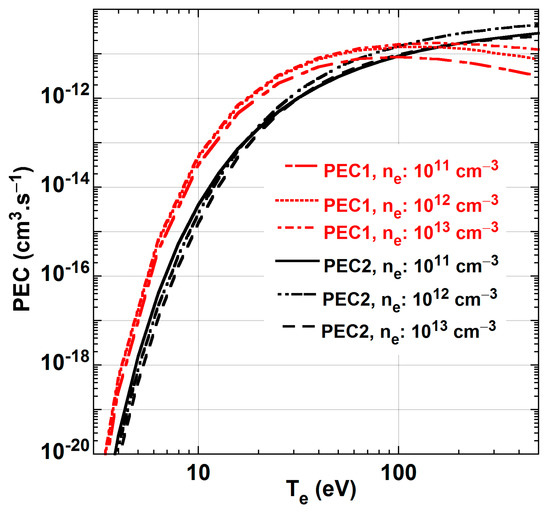 - Goto, M. Collisional-radiative model for neutral helium in plasma revisited. J. Quant. Spectrosc. Radiat. Transf. 2003, 76, 331–344. [Google Scholar] [CrossRef]