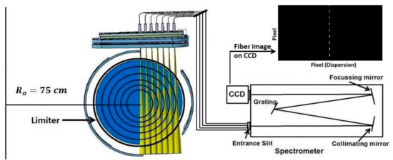The spectral line emissions from various ionization states of carbon impurity ion were captured using a high resolution 1.0 m f/8.7, Czerny-Turner configuration spectrometer (PI Acton, AM 510) equipped with 1800 grooves/mm grating. The light from the plasma to the spectrometer is coupled using a set of optical fibers. A vertical array of nine optical fibers is coupled to the entrance slit of the spectrometer. These nine fibers are of 400 μm core diameter and the fibers have a separation of 700 μm. The image of all the fibers is formed on the CCD detector placed at the exit port of the spectrometer as shown in Figure 1. These images are defined as multi-track on the CCD detector (ANDOR iDUS DV-420 OE) having 1024 × 256 pixels with 26 μm pixel size. The experiments were conducted with 70 μm slit width and CCD exposure time was set to 20 ms to sufficient signal intensity. The CCD readout time was 24 ms and hence, the data was acquired at every 44 ms. For the present measurements, five fibers out of the nine fibers available were used: The four fibers for the LoS mentioned above and one fiber for the in situ wavelength calibration.