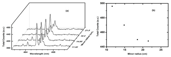 (a) Space resolved spectra of C2+ for four tracks corresponding to four lines of sight and (b) total counts along each line of sight with respect to plasma minor radius.