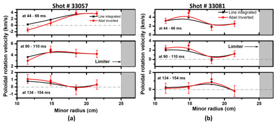 where, is the Doppler shift in nm, is the speed of light in m/s, is the wavelength in nm, and is the angle between the line of sight and the flux surface. In case of poloidal rotation, the measurements are performed from the top of the machine and hence, the angle is considered zero.