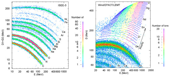Response “matrices”, showing the number of ions for each dE vs. E bin, separate ions into tracks of increasing energy for each element as listed. Light elements are well resolved [52] in the left panel where energy deposit in thin detectors D1 and D2, are plotted against energy deposit in the thick E detector where ions stop.The right panel shows similar D vs. E plot for a telescope with dynamic range above Fe to Hg and U, where heavy elements above Fe are only grouped [41,42,53].