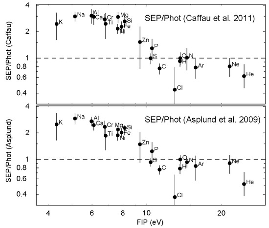 Average solar energetic particle (SEP) abundances [52,58,59] divided by corresponding photospheric abundances are plotted vs. first ionization potential (FIP) comparing photospheric abundances of Asplund et al. [60] (lower panel) and Caffau et al. [61,62] (upper panel). See Appendix A for numerical values.