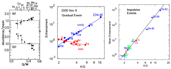 Abundance enhancements, relative to coronal abundances, are shown vs. Q/A for two gradual events by Breneman and Stone [64] (left panel). Variation within an event of enhancement vs. A/Q is shown during a gradual event [28] (center panel). The average enhancement vs. A/Q is shown for impulsive events [44] (right panel). Numbers in panels indicate a range of Z. Power-law enhancements vs. A/Q are quite common in SEP events.