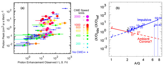 Proton excesses for impulsive SEP events and their possible origin: (a) Peak intensity vs. proton excess shows large excesses for more intense SEP events produced when fast coronal mass ejections (CMEs) can drive shocks. (b) Shocks preferentially reaccelerate pre-enhanced impulsive SEP ions, plus additional protons from the ambient coronal plasma to produce the observed proton excesses [74,75].