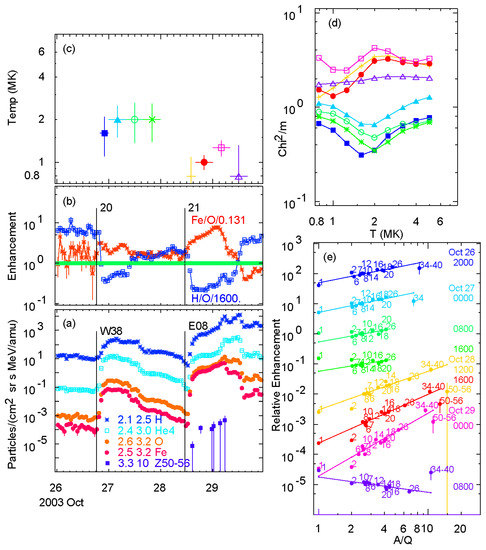 Element abundances vary with time in gradual SEP events, so we analyze them in eight-hour intervals. For each interval we study a wide range of possible source temperatures. Each T defines A/Q values and we fit abundance enhancements vs. A/Q, obtaining a best-fit power law and χ2 for each T. We choose the fit and the T with the smallest χ2. Such fits are shown in Figure 6 during two large gradual SEP events in October 2003 [28,75,76]. The best-fit power laws for Z ≥ 6 are extended down to protons in Figure 6e.