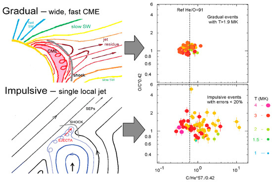These gradual SEP events involving reaccelerated ≈3 MK ions have much smaller variations of source abundance than do single impulsive SEP events of the same temperature, especially in abundance ratios, like He/C, where both ions should be fully ionized at this temperature. Figure 7 shows a suggested explanation for this [75,79].