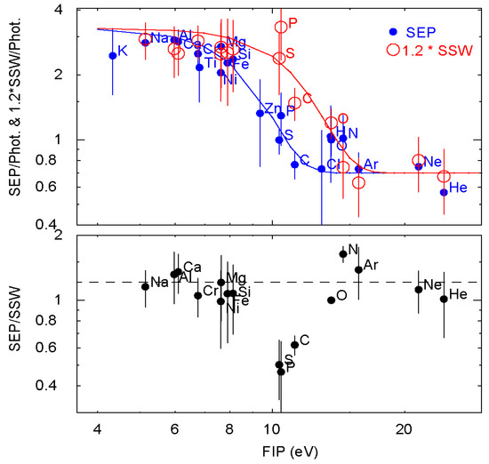 The lower panel shows the SEP/slow solar wind (SSW) abundance ratio vs. FIP for the elements named. The dashed line shows a preferred ratio of ≈1.2. The upper panel shows SEP and 1.2*SSW abundances relative to the photosphere vs. FIP with empirical curves to show the trend of the data [13,59]. See Appendix A for numerical values.