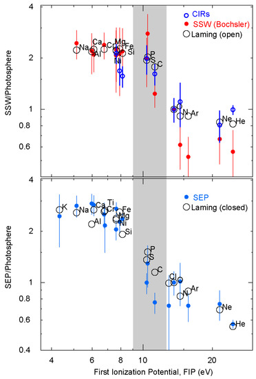 The lower panel compares the FIP pattern of SEPs [59] with the closed loop model of Laming [87] (Table 3). The upper panel compares the SSW [85] and corotating interacting region (CIR) [59] FIP patterns the open field model of Laming [87] (Table 4) [59]. The gray band highlights the region of differences of C, P, and S between the two populations [13,59].