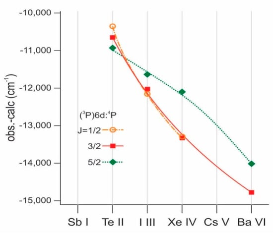 As for the isoelectronic sequence calculations used to produce the plots for observed minus calculated (“obs.-calc.”) trends along the six first elements of the Sb sequence, we used the configurations 5s25p3, 5s25p24f, 5s25p26p, 5s5p36s, 5s5p37s, 5s5p35d, 5s5p3 6d, 5p5 for odd parity and 5s5p4, 5s25p25d, 5s5p35f, 5s25p25g, 5s25p26s, 5s25p26d, 5s25p27s for even parity. The calculations included core polarization effects (HFR+CP), with the values of αd and rc taken from Table 2.