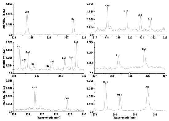 - Burakov, V.S.; Tarasenko, N.V.; Nedelko, M.I.; Kononov, V.A.; Vasilev, N.N.; Isakov, S.N. Analysis of lead and sulfur in environmental samples by double pulse laser induced breakdown spectroscopy. Spectrochim. Acta B 2009, 64, 141–146. [Google Scholar] [CrossRef]