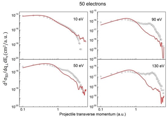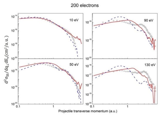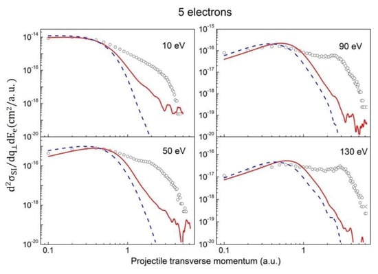 Figure 2, Figure 3 and Figure 4 show the projectile transverse momentum distributions for the emitted electron energies Ee of 10 eV, 50 eV, 90 eV and 130 eV when five, 50 and 200 convoy electrons were involved during the collision, respectively. The present calculations (red curves) were compared with the experimental DDCS (open circles) []. Firstly, we focused on Figure 2. When no convoy electrons were introduced (blue dashed curves), the binary peaks, that were located at larger than 1 a.u., were not reproduced by the 4B-CTMC calculations []. It should be noted that this result was similar to that observed in the calculations where the H target was used instead of the He target []. The introduction of only five convoy electrons already qualitatively improved the calculation, especially for small values of Ee. However, the number of convoy electrons was not enough to reproduce the maxima observed at large values of .