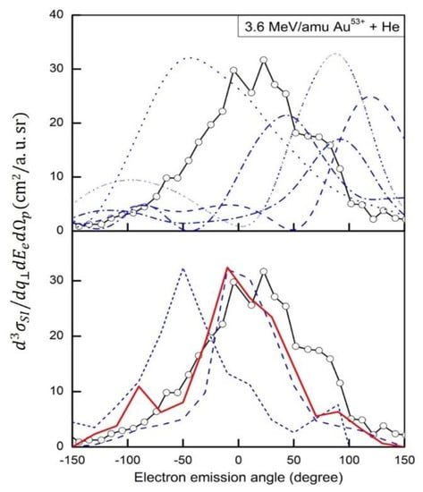 The TDCS measurements and calculations presented a substantial challenge, as they can show up significant discrepancies which can be hidden in less differential cross sections. In the case of the Au53+ + He collisions, as mentioned in the introduction, none of the theoretical interpretations of the experimental results [] were satisfactory. As shown in Figure 5, the experimental TDCS for Ee = 4 eV and = 0.65 a.u. (open circles and black line) presented a maximum at an emitted electron angle around 0°. Among all the previous calculations, only a few theoretical results (see [] and references inside) were shown (blue curves on top of Figure 5). First Born approximation, two-Coulomb wave model, three distorted-wave and three distorted-wave–eikonal-initial-state calculations gave rise to two structures, with a maximum at angles larger than 45°. On the contrary, the continuum-distorted-wave–eikonal-initial-state calculation [] produced a wide structure whose maximum was located at about −50°.