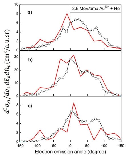 To confirm the validity of our hypothesis, similarly calculated TDCSs were extracted using 20 convoy electrons (red curves in Figure 6) for Ee = 4 eV and = 1 a.u. (Figure 6a), Ee = 10 eV and = 0.65 a.u. (Figure 6b) and Ee = 10 eV and = 1 a.u. (Figure 6c), for which experimental TDCSs were available (open circles). Again, the calculated structures, in contrast with previous calculations, were very close to the experimental results. The maxima were peaked at ~0° and the widths were very close to those observed experimentally. For small values of emitted electron energies and relatively large values of , the number of convoy electrons was of the order of 20, while the total number of convoy electrons was of the order of 200. As mentioned earlier, this was due to the fact that a small energy of the emitted electron energy corresponds to relatively large impact parameters, so that only the convoy electrons that were located far from the projectile axis contributed to the He ionization.