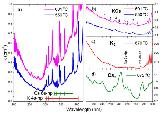 12]. The cesium contribution in the present experiment is much more suppressed because of the appropriate initial composition of alkali constituents (80% potassium and 20% cesium). Our previous measurements of the pure potassium vapor did not reveal any significant photoionization bands in the spectral region below 300 nm, at least for measurements at temperatures below 600 °C. The ionization energy of cesium is 31406.467 cm