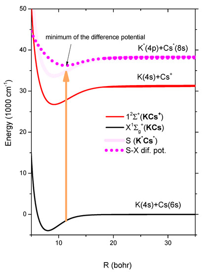 It might be worth mentioning that some of the doubly excited molecular states are asymptotically forbidden in a dipole approximation. However, at smaller internuclear separations, those transitions to doubly excited molecular states may be induced by collisions. The KCs** DES are immersed in the ionization continuum of the KCs molecule and are, therefore, subjected to autoionization. All specific spectral transitions will have a certain lifetime connected with the width of the corresponding spectral lines. The value of the autoionization probability of each doubly excited KCs states (KCs**) will, therefore, determine the extent of the smearing of the observed photoionization band shapes. Some of these doubly excited states could be described as stemming from ion-pair states K+ + Cs*− or K*− + Cs+, where the negative ions are in the appropriate excited states so that the total energy of the ion-pair molecule is lying above the first ionization limit of the KCs molecule.