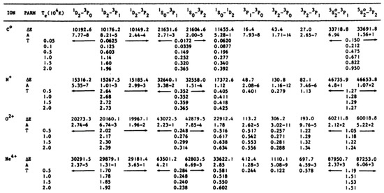 - Phaneuf, R.A.; Defrance, P.; Griffin, D.C.; Hahn, Y.; Pindzola, M.S.; Roszman, L.; Wiese, W.L. Review of Spectroscopic and Electron-Impact Collision Data Base for Cq+ and Oq+ Ions. Phys. Scr. 1989, 28, 5–7. [Google Scholar] [CrossRef]