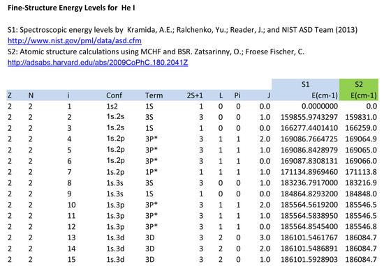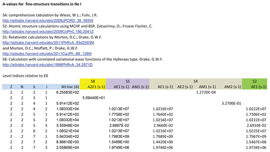 - Wiese, W.L.; Fuhr, J.R.; Kelleher, D.E.; Martin, W.C.; Musgrove, A.; Sugar, J. Critically Evaluated Data for Atomic Spectra. In Astrophysical Applications of Powerful New Databases; Adelman, S.J., Wiese, W.L., Eds.; ASP Conf. Ser.; Astronomical Society of the Pacific: San Francisco, CA, USA, 1995; Volume 78, p. 105. [Google Scholar]