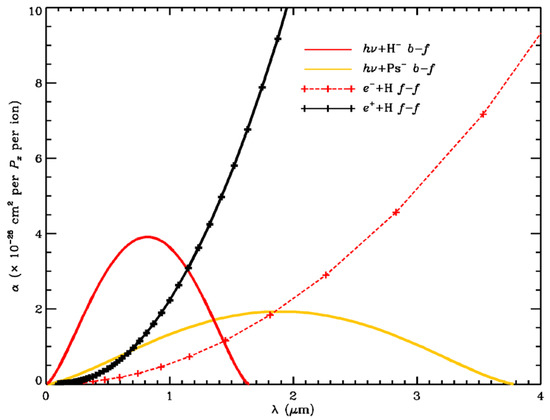 We list the cross sections for bound–free and free–free transitions for electrons and positrons in Table 1 (and show them in Figure 1), where we have assumed a temperature of 6300 K and used the H−/H ratio given by Wheeler and Wildt [17]. This temperature has been used for many years as representative of a typical cool star, including the Sun at an optical depth of approximately 1. We see that the contribution of positrons cannot be neglected in calculations of the opacity of the Sun’s atmosphere.