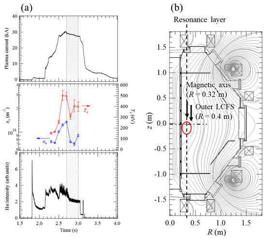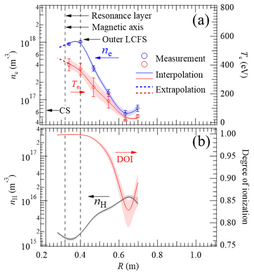We interpolated and measured by Thomson scattering [9] in the same way as as shown in Figure 5a. In addition, the data was linearly extrapolated on the inboard side (R = 0.28−0.34 m) to evaluate around the resonance layer. The extrapolated curves are shown by dashed lines.