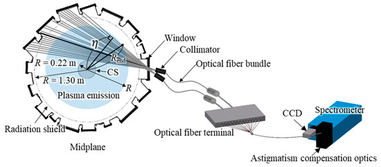 Figure 2 is a schematic illustration of the visible spectroscopic system. We measured the Hδ emission line spectrum (p = 2–6), where p is the principal quantum number, using 24 fan-shaped viewing chords on the midplane. The distance between the viewing chord and the torus axis, which we define as , ranged between 0.24 and 1.01 m. The diameters of the viewing spots were approximately 30 mm at the positions closest to the torus axis.