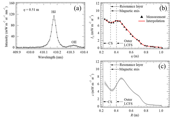 Figure 3a shows a Hδ spectrum measured on the viewing chord at = 0.51 m, which is indicated by the bold line in Figure 2; this position corresponds to the outer scrape-off-layer (SOL). We evaluated the chord-integrated intensity from the area of the spectrum. The evaluated is marked in Figure 3b. The error bars consist of uncertainties in the sensitivity calibration coefficient and the zero level of the spectrum. Note that the pedestal of the OII emission line at 410.32 nm is superposed on that of Hδ, but its effect on is small and we neglected it. Additionally, we omitted obtained on the chord at = 0.84 m owing to the large noise produced by the incidence of X-rays to the CCD.