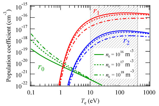 Figure 4 shows the calculated population coefficients for = 6, where the green, red, and blue lines represent , , and , and the solid, dashed, and dash-dotted lines are those at = 1016, 1017, and 1018 m−3, respectively. and of the present plasma are in the ranges of 10 400 eV and 1016 1018 m−3, respectively (see Figure 5a), and the former is denoted by the shaded area in Figure 4. Considering the relative magnitudes of the population coefficients and the approximated charge neutrality condition , we can neglect the first term of Equation (2). We can also neglect the third term by assuming that , which is reasonable except for near the wall. Equation (2) is then approximated as follows: