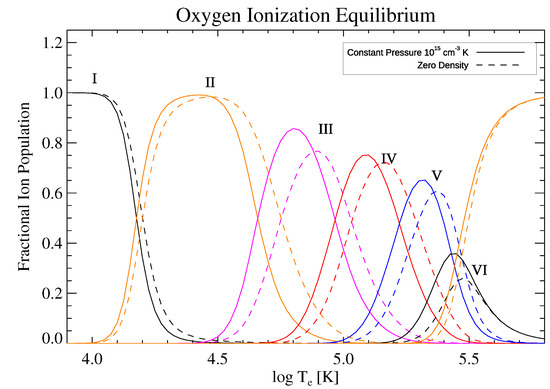 - Dufresne, R.P.; Del Zanna, G.; Badnell, N.R. Effects of density on the oxygen ionization equilibrium in collisional plasmas. Mon. Not. R. Astron. Soc. 2020, 497, 1443–1456. [Google Scholar] [CrossRef]