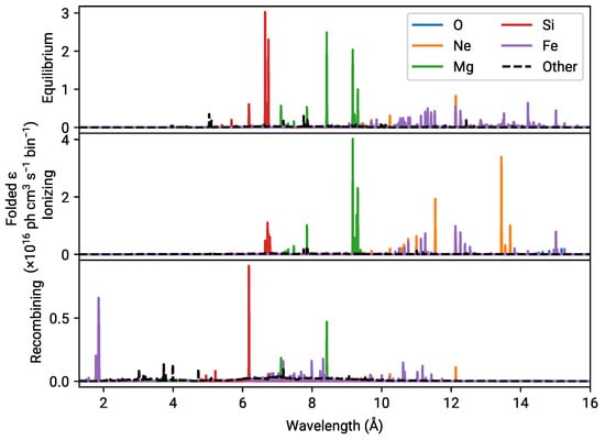 −3s. The ionizing case is dominated by He-like lines of Si and Ne, while the recombining case shows significant emission from He- and H-like Fe, as well as the H-like Si and Mg ions.
