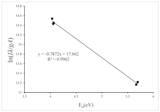 Boltzmann plot method: To determine the plasma temperature using the Boltzmann plot method, Equation (1) is used; this gives the spectral line gradient intensity [4,7].