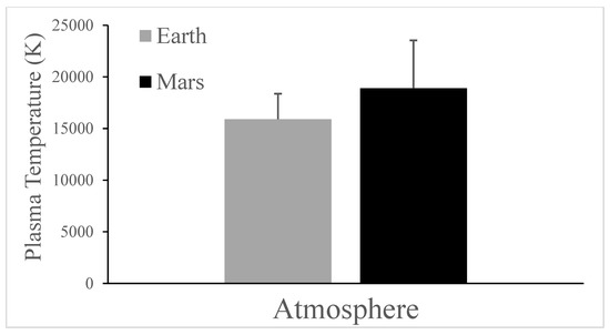 Figure 2 shows a comparison between the average temperatures calculated from the Martian and Earth samples. The graph clearly shows that the temperatures calculated from the Earth samples were generally lower than the Martian samples. It also shows that the average temperatures were not significantly different from each other. It was thought that the potential cause for the lower plasma temperatures on Earth could be due to the fact that the data were taken in gated mode and the earliest part of the plasma formation where the plasma is hottest was not taken in account. However, these data were also taken using a zero-microsecond time delay with a 20 μs gate width; analysis of these data shows a slightly lower plasma temperature than the one-microsecond time delay; these data were added in Table 2. The temperatures were lower using a time delay of 0 μs but they were not significantly different from the 1 μs time delay temperature data. The average temperature here was determined to be 13,200 K.