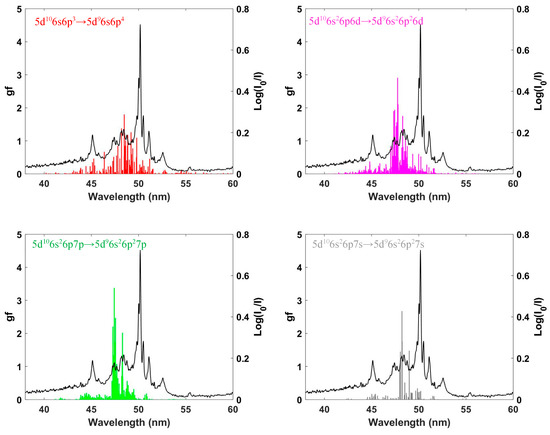In Figure 2, we show the contribution of 5d → 6p transitions from low-lying excited configurations of Bi+ to the overall absorption spectrum. The plasma temperature was expected to be less than 2 eV for the prevailing experimental conditions [34], and so the population of low-lying excited states would be expected to be a low % of the ground state population. Their contribution to the measured spectrum was thus expected to be finite, but small.
