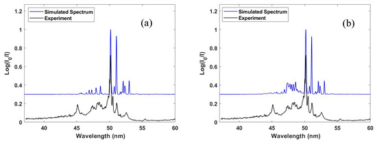 In Figure 3, we show the measured photoabsorption spectrum of Bi+ compared with synthetic spectra built from the convolution of the gf values with a Gaussian function (0.045 nm FWHM), chosen to represent the spectrometer instrument function. In Figure 3a, the simulation included photoabsorption from the ground electron configuration only. The resulting synthetic spectrum exhibited reasonable agreement with the experimental data. The relative heights and positions of the overall spectrum and some discrete features were reproduced by the calculation, specifically, the discrete photoabsorption features at 50.02 nm (5d106s26p2 (1S) 1D2 → 5d96s26p3 (2D) 1D2), 50.18 nm (5d106s26p2 (1S) 1D2 → 5d96s26p3 (2D) 1F3) and 51.08 nm (5d106s26p2 (1S) 3P2 → 5d96s26p3 (4S) 3D3). As shown in Figure 2, there were features in the 47–50 nm region due to the 5d → 6p transitions from excited states of Bi+. Specifically, there were quite strong features in the 48.01–48.85 nm and 47.15–47.82 nm spectral regions. Some of the most intense of these transitions are listed in Table 2. In Figure 3b, we added contributions due to photoabsorption from these low-lying excited states to Figure 3a. The gf values for the associated transitions were multiplied by a small factor (5%) before including them in this synthetic spectrum. This in line with the low plasma temperature alluded to the above. It is clear that the transitions did indeed make a small but finite contribution to the overall spectral distribution.