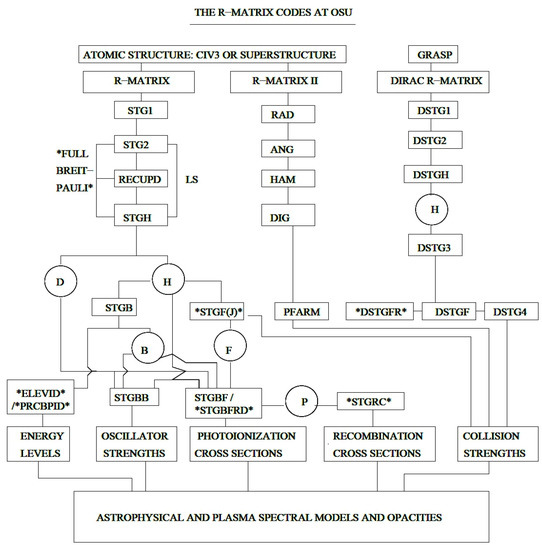 As shown in Figure 2, R-matrix calculations can have 3 branches to proceed—(1) coupling and relativistic Breit–Pauli, (2) large configuration interaction coupling, (3) Dirac relativistic. Various stages generate Hamiltonian matrix (H), dipole matrices (D), bound wave functions (B), and continuum wave functions (F). End results are (1) energy levels, (2) oscillator strengths, (3) photoionization cross sections, (4) recombination rate coefficients, and (5) collision strengths, which are applied to astrophysical models.
