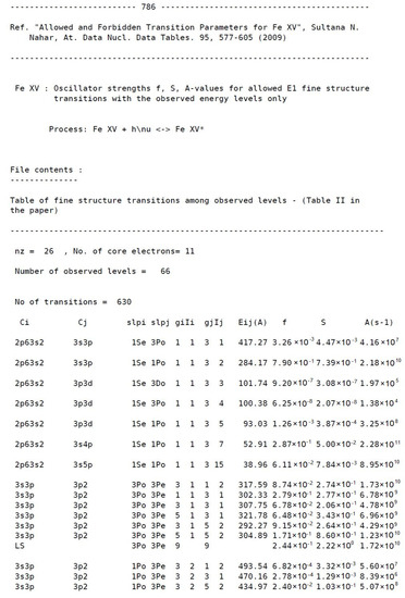 - Nahar, S.N. Oscillator Strengths and Transition Probabilities for Allowed and Forbidden Transition in Fe XIX. At. Data Nucl. Data Tables 2011, 97, 403–425. [Google Scholar] [CrossRef]