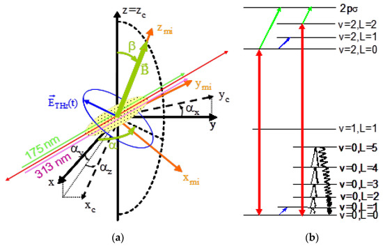 with real positive amplitudes and phases having linear or circular polarizations defined with . The orientation of the MICF relative to the can be changed by varying the currents in the coils. The relative orientation of the two coordinate frames is defined with the Euler angles (the third angle being fixed here arbitrarily to zero). Each standard component of the THz electric field in the MICF, denoted with , couples off-resonantly to the π or σ± Zeeman subcomponents of the (v, L) = (v, 0)→(v, 1) transitions and induces a lightshift in proportion with its squared amplitude. The standard components of the THz electric field in the MICF are related to the polarization ellipse parameters in the LCF: