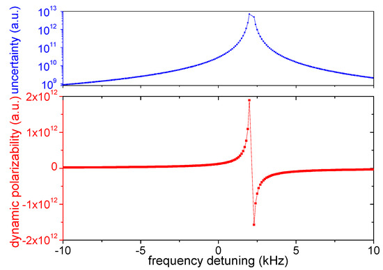 The errors of are assumed to be uncorrelated, and the uncertainties are the same. The second line of Equation (18) indicates the expression of the covariance of the inverse matrix elements calculated with the approach presented in [50]. The last two lines give the expression of the covariance between the differential standard dynamic polarizabilities, which are determined with the error propagation law from the covariances between the theoretical parameters , the dependences on the magnetic field magnitude, and the frequency of the THz wave, respectively. The covariances of are indicated in Section 2.4, the covariance of the magnetic field magnitudes may be calculated with Equation (16), and the uncertainty of the THz wave frequency is assumed fractionally at the ppt level.