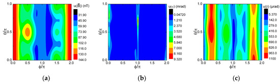 Estimated uncertainties of the spherical components of the magnetic field in the LCF as a function of the spherical angles (φ, θ) for I0 = 1 A: (a) Uncertainty of the magnetic field strength; (b) Uncertainty of the magnetic field azimuth angle; (c) Uncertainty of the magnetic field zenith angle.