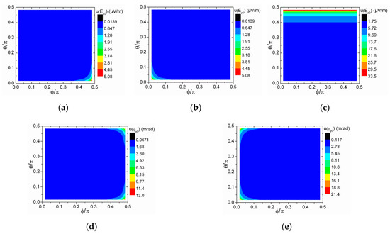 Estimated uncertainties of the amplitudes and phases of the components of the THz electric field in the LCF as a function of the spherical angles (φ, θ): (a) Uncertainty of Ex,0; (b) Uncertainty of Ey,0; (c) Uncertainty of Ez,0; (d) Uncertainty of φx,0; (e) Uncertainty of φy,0.