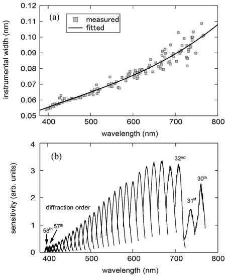 For the purpose of wavelength calibration and resolution estimation, we measure emission lines of a Th-Ar hollow cathode lamp (Heraeus, P858A) [12] because it has many emission lines in the visible region and the line widths are small enough. The instrumental function of the spectrometer is found to be approximated by a Gaussian profile. We evaluate the instrumental width (full width at the half maximum) by fitting bright Th and Ar lines with a Gaussian function. Figure 2a shows the evaluated width at the entrance slit width of 25 μm as a function of the wavelength. The curve in the figure is the result of the fit with a third-order polynomial function. We use this fitted curve as the instrumental width at an arbitrary wavelength in the spectral shape analysis explained later. We also calibrate the relative sensitivity of the spectrometer for the whole wavelength region using a tungsten standard lamp with an integrating sphere (Labsphere, USS-600C, North Sutton, NH, USA) [12]. The result of the sensitivity calibration is shown in Figure 2b.