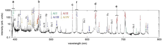 More than 100 emission lines are resolved, in which more than 50 lines are identified as Al I, Al II, Al III and Al IV lines from available databases [13,14]. The identified lines are indicated in Figure 5 by arrows and listed in Table 1, Table 2, Table 3 and Table 4. The lines denoted by ‘a–f’ are used to estimate electron density of the ablation cloud from their Stark width, as explained below. Since the LHD plasma contains hydrogen, helium, argon, etc., emission lines of these elements are also seen in Figure 5.