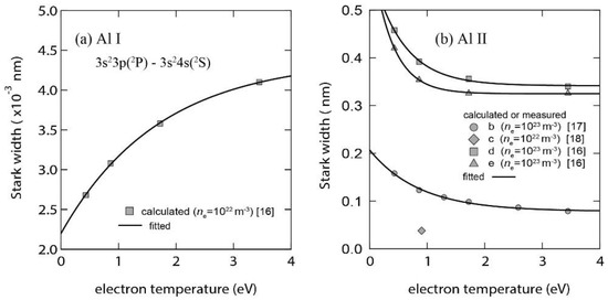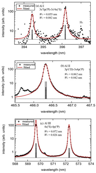 Regarding Al III lines, WS of only the line denoted by ‘f’ in Figure 5 and Table 3 was measured at = 4.3 eV and = 1024 ~ 1025 m−3 [18], as far as the authors know. With the assumption that the difference of between = 4.3 eV and the Al2+ plasma electron temperature ( = 2.5 eV) is negligibly small, we determine , and then estimate of the Al2+ plasma from the observed . The result is shown in Table 7.