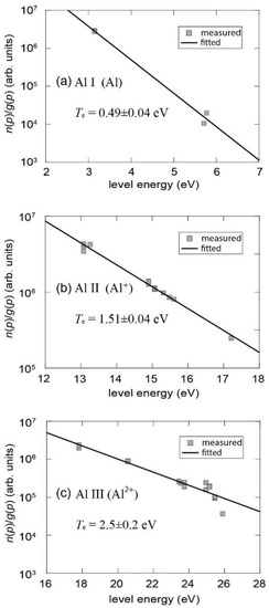 where is Planck’s constant. and are the frequency of light and the spontaneous transition probability, respectively. Populations of excited levels of atoms and ions in the ablation cloud can be estimated from the observed line intensities with Equation (1) for well-resolved emission lines, enough to evaluate the area of the spectra having available transition probabilities [13,14]. The results for neutral aluminum atoms (Al), singly ionized aluminum ions (Al+) and doubly ionized aluminum ions (Al2+) are shown in Figure 7 by the Boltzmann plot against the upper level energy [12]. It is clear that the population distribution can be fitted with a straight line for each charge state.