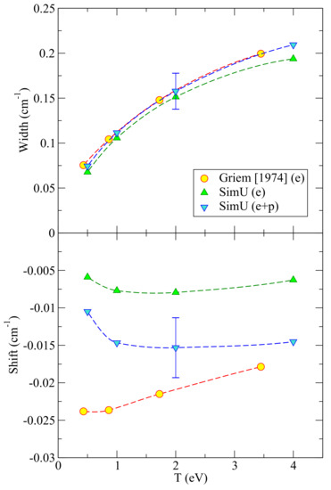 We begin with plasma-broadening calculations, without the laser field. The results are shown in Figure 1, with the previously calculated data [3] given for comparison. As seen, our results are in a very good agreement with [3] as far as the width is concerned. The shifts differ notably. It is worth noting that, contrary to the width that is mostly affected by electrons, the shift is significantly influenced by the plasma ions, too. The lighter (faster) the ions, the larger their effect is. Therefore, assuming a proton–electron plasma (with oxygen as a minority), as is done in our calculations, gives the upper bound on the effect of singly charged ions of any kind.